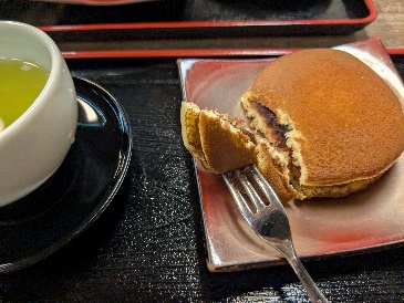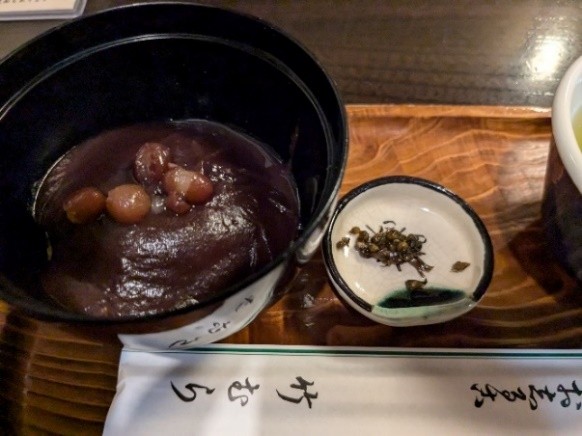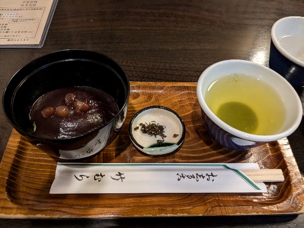 三分の一ほど進んだら緑茶を挟み、しばし瞑想。そして、再び粟ぜんざいだ。手間暇かけた一品とそれを引き立たせる脇役たち。桜茶やしその実漬けと緑茶。〆て880円也。変わらぬ味ともてなしを堪能した。
