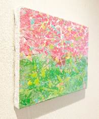 鮮やかなピンクとグリーンの交わりが、春の雨上がりのような生命感を放つこの作品。