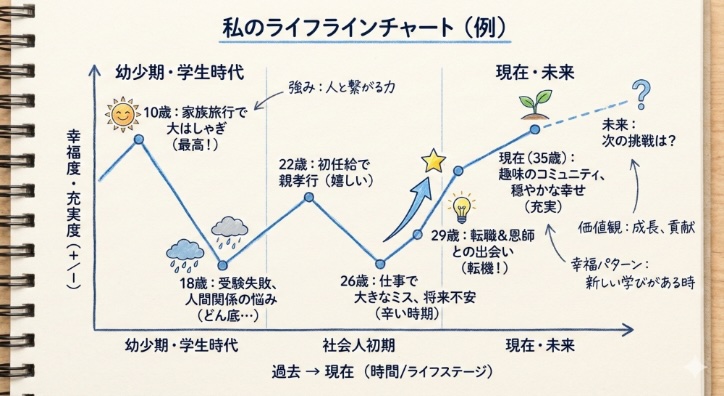 - 年齢順にそれらの出来事を線で結んでいく。すると、ほとんどの人はラインを挟んでジグザグの線ができるだろう。